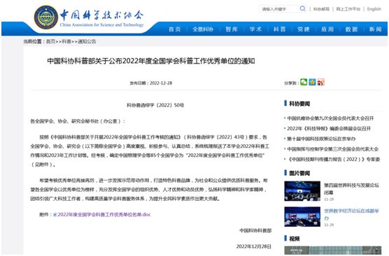 喜報!中國地質學會榮獲2022年度全國學會科普工作優(yōu)秀單位