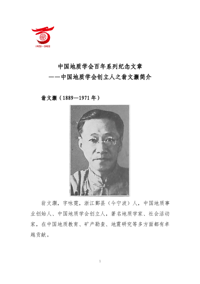 中國(guó)地質(zhì)學(xué)會(huì)百年系列紀(jì)念文章之三中國(guó)地質(zhì)學(xué)會(huì)之創(chuàng)立人翁文灝簡(jiǎn)介