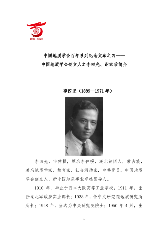 中國(guó)地質(zhì)學(xué)會(huì)百年系列紀(jì)念文章之四——中國(guó)地質(zhì)學(xué)會(huì)創(chuàng)立人之李四光、謝家榮簡(jiǎn)介