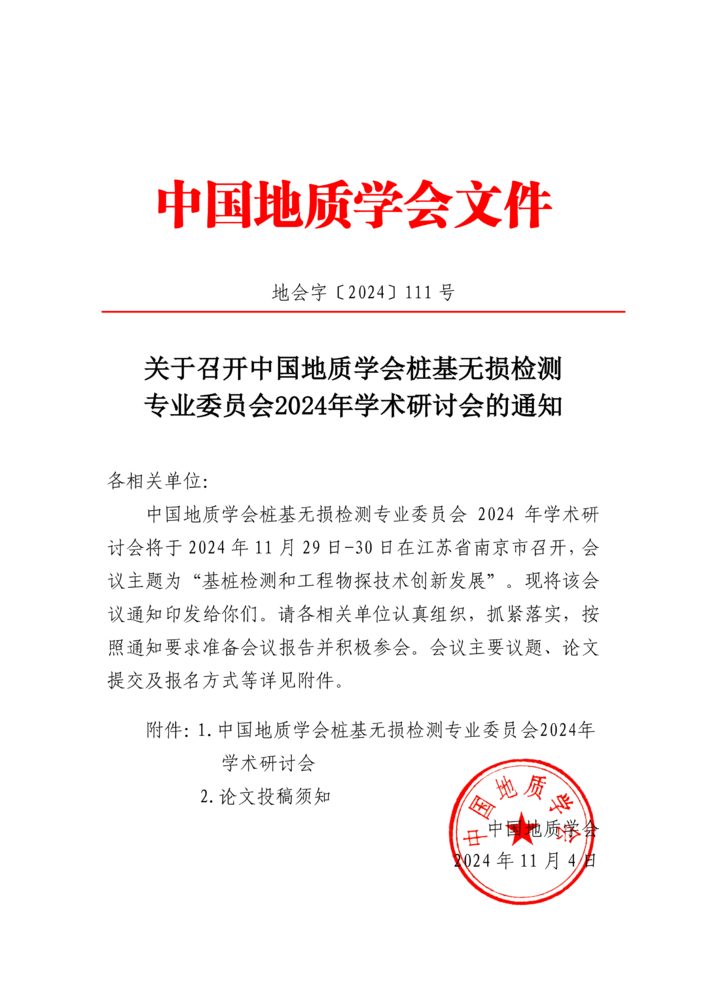 ? 關(guān)于召開(kāi)中國(guó)地質(zhì)學(xué)會(huì)樁基無(wú)損檢測(cè)專業(yè)委員會(huì)2024年學(xué)術(shù)研討會(huì)的通知 2024-11-06