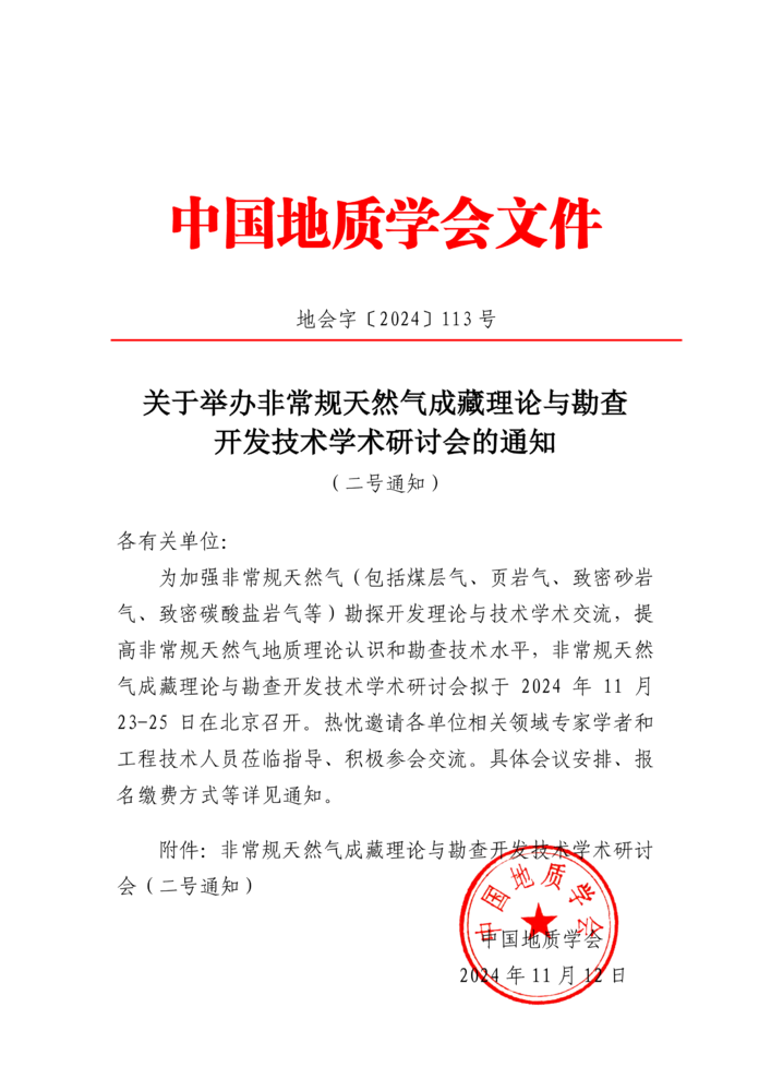 ? 關(guān)于舉辦非常規(guī)天然氣成藏理論與勘查開(kāi)發(fā)技術(shù)學(xué)術(shù)研討會(huì)的通知(二號(hào)通知) 2024-11-13